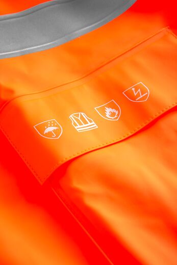 Certified workwear for protection of High-Visibility Protective clothing certified according to EN ISO 20471, which specifies the requirements for High-Visibility. The combination of fluorescent material with reflective tape should provide the visibility of the user in all lighting conditions, both in daylight and under the illumination of headlights in the dark. The number (x) next to the pictogram indicates which class is related to the surface of both fluorescent and reflective material. The classification goes from 1-3, where 3 is the highest.