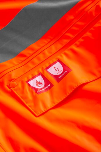 Lyngsøe Hi-Vis vinterregnjakke i brandhæmmendePU kvalitet med quiltet foer50% Polyester, 50% Polyurethan, 210 g/m2Foer: FR Quiltet bomuldsfoer med polyester fyld