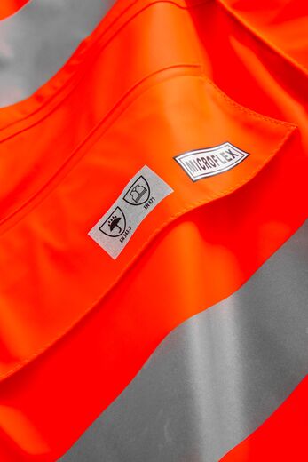 Certificeret arbejdstøj til beskyttelse af høj synlighed Beskyttelsesbeklædning certificeret i henhold til EN ISO 20471, der specificerer kravene til høj synlighed. Kombinationen af fluorescerende materiale med reflekterende tape skal give synligheden af brugeren i alle lysforhold, såvel i dagslys som under belysning af forlygter i mørke. Tallet (x) ud for piktogrammet indikerer hvilken klasse, der er relateret til overfladen af både fluorescerende og det reflekterende materiale. Klassificeringen går fra 1-3, hvor 3 er det højeste.
