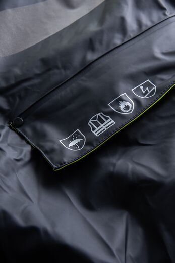 Certificeret arbejdstøj til beskyttelse mod regn Beskyttelsesbeklædning certificeret i henhold til EN 343, beskyttelse mod nedbør som regn eller sne, tåge og jord fugtighed. Beklædningen og sømmene er testet for vandtætheden (x) men også vanddampgennemtrængelighed, også kaldet åndbarhed (y). Disse værdier går fra 1-3, hvor 3 er det højeste.