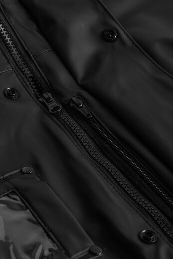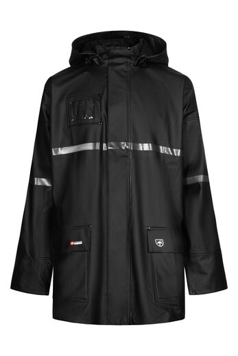 • Aftagelig hætte med snøre• Stor hætte som passer over hjelm• Brystlomme til ID-kort• Skjult brystlomme• To frontlommer med trykknapper• Skjult lynlås med trykknaplukning• Ventilation i ryggen• Sort reflekterende detaljer