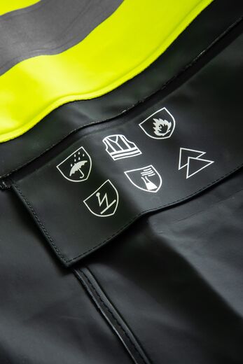 Certificeret arbejdstøj til beskyttelse mod regn Beskyttelsesbeklædning certificeret i henhold til EN 343, beskyttelse mod nedbør som regn eller sne, tåge og jord fugtighed. Beklædningen og sømmene er testet for vandtætheden (x) men også vanddampgennemtrængelighed, også kaldet åndbarhed (y). Disse værdier går fra 1-3, hvor 3 er det højeste.